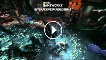 Check out the incredible effects NVIDIA GameWorks brings to Batman Arkham Knight! Smoke and fog react to the movement in the fight scenes, including when a box is thrown or part of the floor blows up into piece. Paper debris gets kicked around as Batman takes on all the baddies. Enhanced rain allows the rain to naturally bead off when coming into contact with Batman and his cape.