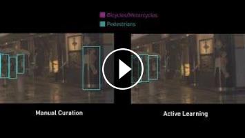 Active learning makes it possible for AI to automatically choose the right training data. An ensemble of dedicated DNNs goes through a pool of image frames, flagging frames that it finds to be confusing. These frames are then labeled and added to the training dataset. This process can improve DNN perception in difficult conditions, such as nighttime pedestrian detection.